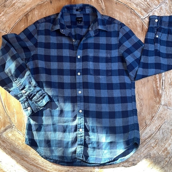 J CREW Men’s Linen Blend Button Down in Blue Plaid, Size M, Slim Fit