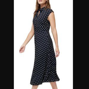 Pretty pleats, cap sleeves and a collar are just a few of the details on this dot-print dress that make it a standout for the office (and after-hours hangs).