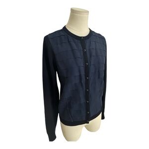 J. CREW Navy Blue Cardigan Sweater 100% Merino Wool Silk Ruffles Buttons Size M