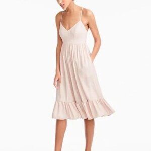 J. Crew ballerina-inspired midi dress in soft pink. Features a fitted bodice with spaghetti straps, a gathered waistline, and a draped skirt finished with a ruffle hem. Elegant yet simple, this style is perfect for garden parties, weddings, or spring events.