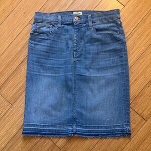 Medium indigo wash, light distress, unique raw hem with five pockets, stud/zip front closure.  Made from cotton/polyester/elastane blend.  Easy wash. Women's size 28 with 30" length.  Hits at the knee.  Pre-owned in good condition.