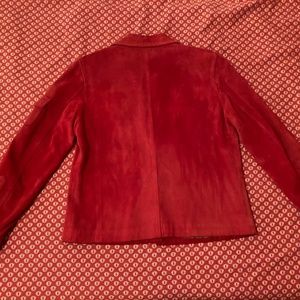 J CREW Red SuedeUtility/Trucker Jacket - Size M (8-10). EUC. Red is THE COLOR for FALL/WINTER 2023! Reposhed from secondhandhippi. I love this jacket but it was a little small for me so I never wore it. Very soft suede with a nice weight and drape and lots of pockets. Like a jean jacket but better. The color is most true in the last photo. Here’s the original listing information: (I used my own photos.)