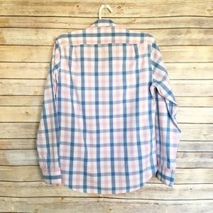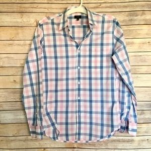 Regular fit casual button down shirt by J. Crew Factory line. White buttons, full length sleeves, standard collar. Multicolor tattersall is plaid or checkered pattern.