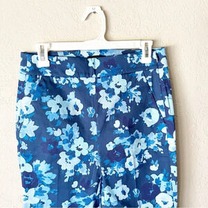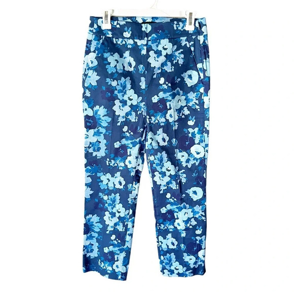 DETAILS: J. Crew size 6. Remi style in blue watercolor begonia floral print, high rise, slim silhouette, cropped length, side zip closure. Cotton spandex blend, machine wash. Style AJ333.