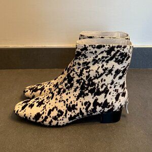 Features: low-heel ankle boot, sleek center seam, stylish gold zipper back for easy on-off, luxe Italian calf hair upper, leather lining sourced from a certified sustainable tannery, subtle square toe. Color: cream black "snow pony" animal print.