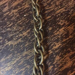Blue and black stripe design on both sides of bag; Interior zipper pocket, black lining; Bronze colored chain strap;Top zipper closure; 100 % Silk.