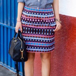 This is a gently used women's J. Crew Salon Gemstone Print mini skirt with pockets.