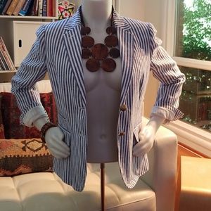 Incredible find, never worn, 100% linen schoolboy blazer! Security tag and thread from lower back vent still intact. I'm just not a 6 anymore! I like to style a structured piece like this with wood and textured, more natural accessories, but maybe you have coordinating suit pants! Pretty, gold buttons.