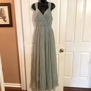 Lightweight crinkled silk chiffon in a beautiful pastel mint (official color name is dusty shale). Grecian inspired draped bust with a gorgeous flowing skirt. Silicone stay band around bustling. Fully lined. Hidden side zipper.