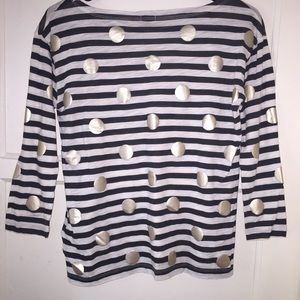 Brown & white stripes with gold circles / Size XXS but I typically wear a S or M tops and it fits me perfectly / Casual & lightweight ✨