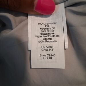 Material: Exterior is 100% polyester.. Interior is 60% down and remainder is waterfowl feathers