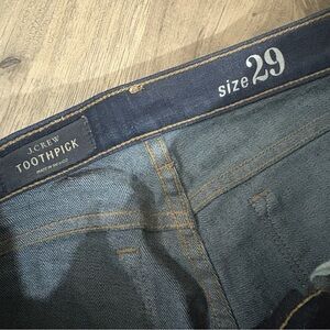 These J. Crew Toothpick skinny jeans for women in size 29 feature a dark wash and are made of a comfortable cotton blend with stretch. They have a high rise and a 28-inch inseam, offering a flattering fit. The jeans have a classic 5-pocket design with zip and button closure, making them a versatile addition to your wardrobe for any season.