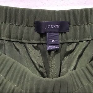 Experience the perfect blend of comfort and style with J. Crew's green track pants. Airy yet substantial crepe feeling poly fabric makes this cool style a presentable and multi-setting athleisure piece. Featuring a tapered leg and ankle-length cut, these pants are crafted from a lightweight fabric that offers a relaxed yet structured fit. Ideal for both casual outings and semi-dressy occasions, they bring a touch of military-inspired elegance to your wardrobe. Staple olive green goes with everything, elasticized waist and cuffs, trendy ankle cut, and functional side zipper pockets. Great pre-owned condition. Size 0.