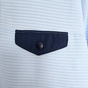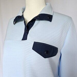 FEATURES: Light blue with navy trim pullover, one quarter (1/4) snap front. Lightweight with soft ribbed/quilted texture. Perfect for days at the beach, on a cruise, or other vacations where you just need something lightweight and soft. Snap pocket on the front. Snap v-neck collar.