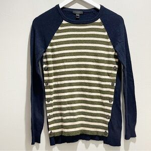 J CREW Women’s Navy Green Side Button Wool Blend Striped Sweater Elbow Patch XS