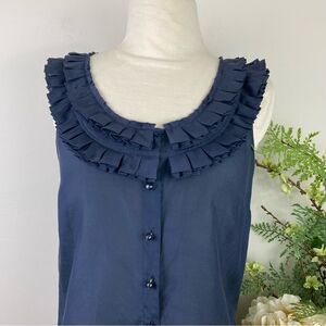 Simply sweet navy silk blouse. Two raw hemmed ruffles around scoop neckline. Button closure. Bra strap holders. Sleeveless.