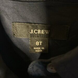 J CREW dark blue ruffle front and bottom cotton poplin maxi dress. Tie waist blue belt. Button down front. Photo shows Zipper on left side under the arm. PreLoved but in beautiful condition. Size 8T. Lining underneath. Beautiful dress! Great thrift find! 🤩 Measures approximately 17 inches arm pit to arm pit and 53 inches in H.