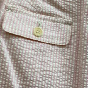 J Crew pink and white 0 seersucker skirt. Waist measures 14 inches. Length 22 inches. Like new. Slit in the back. Zips on the side. Back pockets.