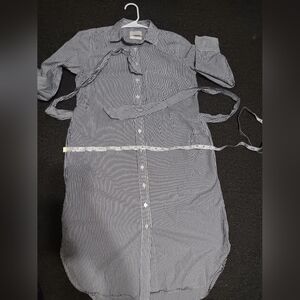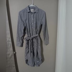 like new,This J. Crew shirt dress features a classic blue and white pinstripe pattern, perfect for casual or work settings. With its long cuffed sleeves and dress shirt collar, it offers a polished look. The tie front adds a touch of elegance, making it a versatile addition to your wardrobe.