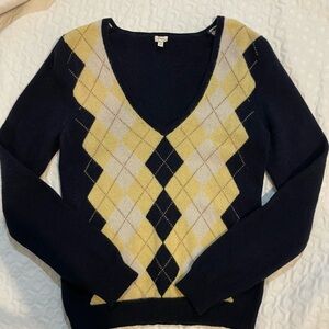 J Crew 100% Lambs Wool Sweater Black and Yellow Checkered Print V-Neck Large