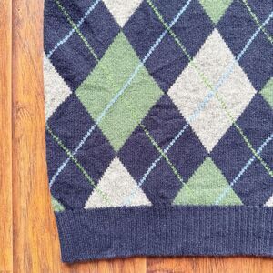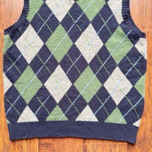 J Crew Men's 100% Lambs Wool Pullover Sweater Vest. Classic Navy and Green Argyle Print. Men's size Large.