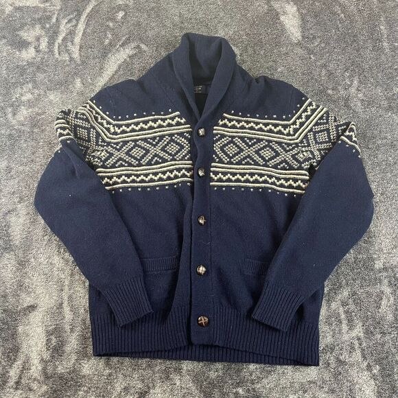 J. Crew 100% Lambswool Collared Cardigan Navy Blue Fair Isle Men's M Fisherman