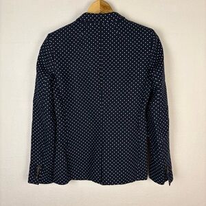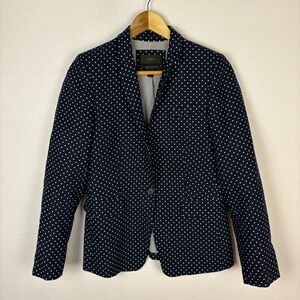 This J. Crew blazer features a sophisticated navy blue base adorned with a subtle white polka dot pattern. The tailored silhouette and single button provide a classic touch. Crafted from 100% linen fabric, with striped lining, this blazer is perfect for both formal and casual occasions.