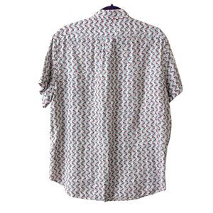 This J.Crew button-up shirt is a must-have for any stylish man's wardrobe. Made from 100% linen, it features a classic fit and short sleeves, perfect for travel and casual occasions. The shirt boasts a unique animal print, with birds and other creatures adorning the white fabric. The woven material is lightweight and breathable, making it ideal for wearing during the summer, fall, or spring seasons.