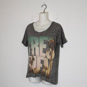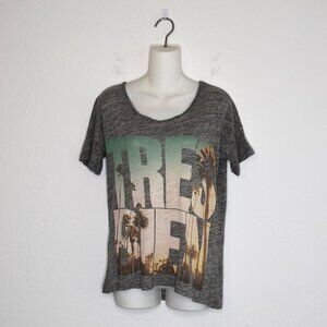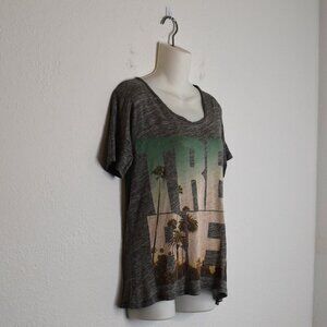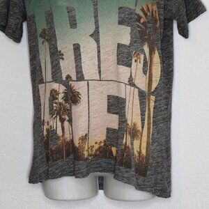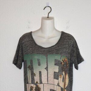 Pre-owned, good condition w/ minor flaw. Normal signs of wash and wear. Artsy graphic print "Trés Bien" (Very well) in bold letters with beach themed design - palm trees and sunset shades - over a neutral dark gray background. Scoop neckline. Short sleeves. Slouchy, relaxed fit. Size per tag: XS (Extra Small). Fabric: 100% Linen. Size per tag does not guarantee desired fit, please see pictures for measurements.