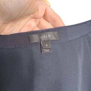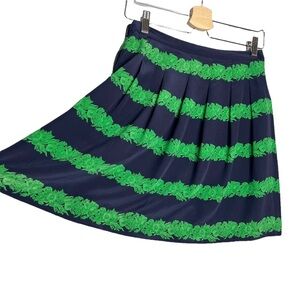 J Crew 100% Silk Beanstalk Striped Pleated Skirt. Size 0 and in gently preowned condition. Navy blue and bright green floral horizontal stripes. Soft pleats all over. Side zipper closure. Lined underneath. Lightweight. A line silhouette.