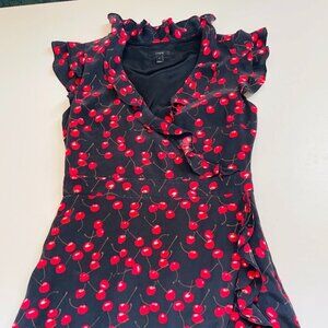 J. Crew 100% Silk Black Cherry Print Ruffle Cap Sleeve V Neck Midi Dress V Neck