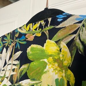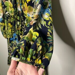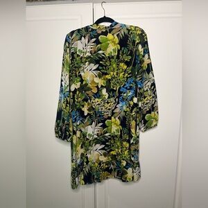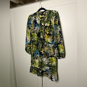 100% silk summer vacation dress with a tiered flounce hem. Buttons and tie at the neck. One button at the hem of the sleeve. Excellent pre owned condition without flaws. Tagged a size small.
