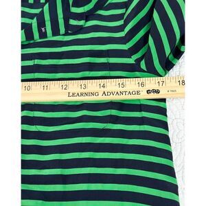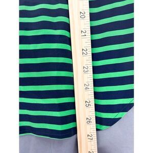 Lovely silk blouse from J. Crew in navy and green stripes, Size 0, excellent pre-owned condition. Please see photos for details and measurement information.