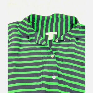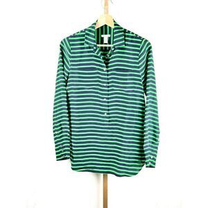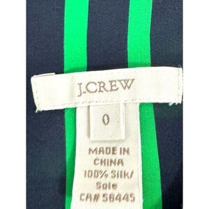 J. Crew 100% Silk Navy and Green Striped Collared Button-Up Sz 0 Excellent Cond.