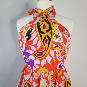 J Crew 100% Silk Sarong Halter Maxi Dress Orange Painted Paisley Size 4 Pleated