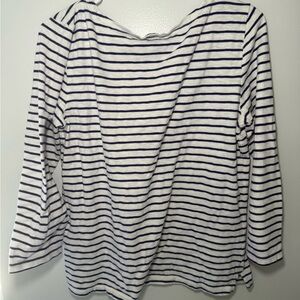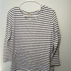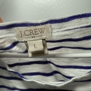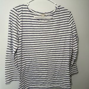This J. Crew top showcases a relaxed, boxy silhouette with a chic white and black stripe design. The 3/4 sleeves and soft fabric ensure comfort and style for any casual setting. Its timeless appeal makes it a versatile addition to any wardrobe.