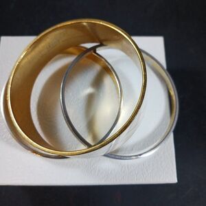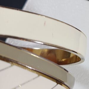 Good used condition, light scratches inside, light stain in 1 bangle shown in 3rd picture. No dust bag no box. Please scroll picture for more details. J. Crew 3pcs Cream Grey Enamel Gold Tone Bangle Bracelet. Pet and smoke free home.