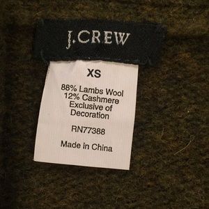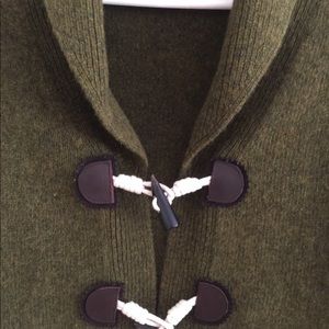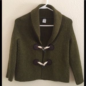 J Crew wool and cashmere cardigan - olive green cardigan with cowl collar and toggle closure on front, with leather accents. Cropped cardigan. The sweater is a a really good condition.
