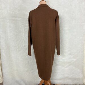 This is a brown knit, long sleeve, long length, duster, open front, ribbed cuff, patch pocket cardigan sweater jacket coatigan from J. Crew. Cotton, polyester, merino wool knit. No flaws. For reference the mannequin is a size 6-8 with measurements of: 34 in 26 in 35 in.