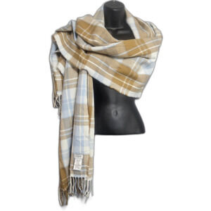J. Crew Acrylic Plaid Blanket Scarf Blue and Tan with Fringe 24X78