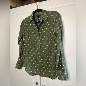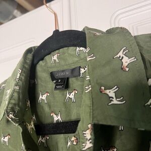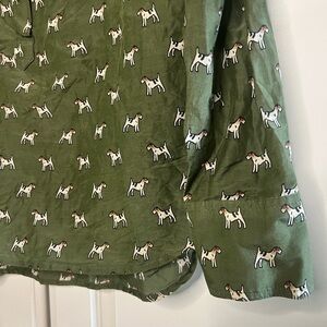 Jack Russel terrier print on an army green background. Half button up with collar. Material is a cotton silk blend and is very lightweight. Size 2. No flaws.