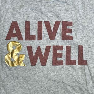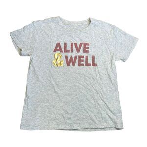 J. Crew Graphic Tee in Light Gray Cotton Knit with an adorable front graphic that says Alive & Well in Burgundy and Gold. It is Short Sleeve, has a Crewneck and is a Pull-Over style. It is great for casual days, school, the gym, running errands, and Family Dinner. It would make a great Christmas Hanukkah Valentine’s Day Birthday or any Holiday gift!