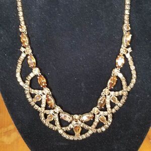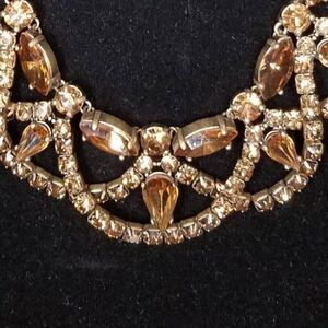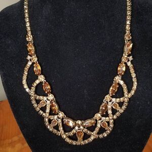 Necklace is in very good pre owned condition. Brass and Amber colored Crystal Rhinestone form a lacy collar Gorgeous!