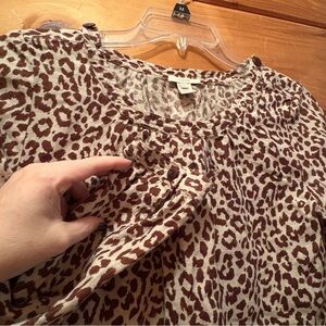 This chic blouse features a striking leopard print in dark brown against a lighter background. Designed with 3/4 sleeves and a smocked style, it offers a relaxed fit that is perfect for both casual and dressy occasions.