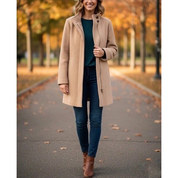 J Crew BU261 Womens Wool City Coat Long Sleeve Zip-Up Button Neck Tan 18