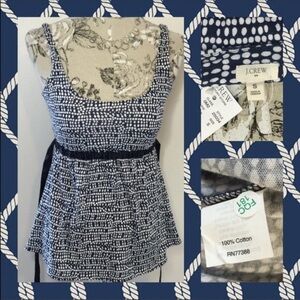 J. Crew size Small, Babydoll style, empire waist, sleeveless tank top has a satin ribbon along the elastic waist that ties in the back that adds to the flattering fit. With its unique pattern of navy blue & white dots it looks great on its own or paired w/a cardigan on cooler nights.