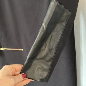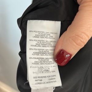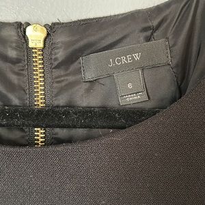 J. Crew Black 3/4 Sleeve Shift Dress With its added exposed zipper pockets and faux leather patches on the sleeves, this flattering LBD is sure to make anyone stand out. The fit is a straight silhouette. The fabric content is polyester, viscose, and elastase. It features 3/4 length sleeves, an exposed back gold zipper, zipper pockets, a full lining.