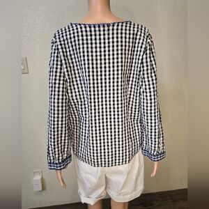 This J.CREW tunic top in size Large features a stylish Black Blue Gingham Plaid pattern with floral embroidered accents on the square neckline, adding a touch of Bohemian and designer flair. Made from 100% Cotton fabric, this lightweight and breathable top is ideal for various occasions like travel, parties, casual outings, or workwear in the summer, fall, or spring seasons. The pullover style with long sleeves and a regular fit offers comfort and easy care, making it a versatile and fashionable addition to any woman's wardrobe.