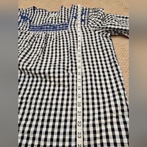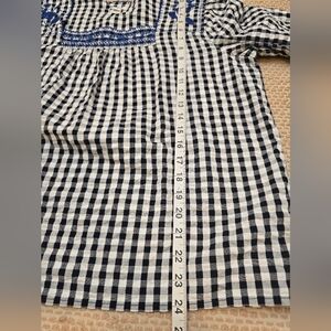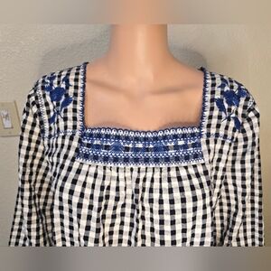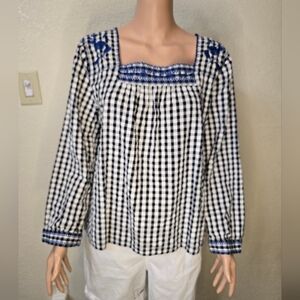J. Crew Black Blue Gingham Plaid Floral Embroidered Square Neck Tunic Top Large