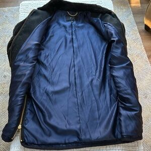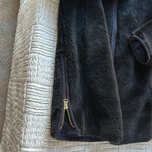 Cozy black fleece faux fur long tunic length jacket by J. Crew. Features a full zip front. Perfect for chilly days. Excellent preowned condition. Full front gold zipper closure. Vertical Side vent zipper closures on near side bottom hem. Beautifully lined with a dark satin lining. Front side hand pockets. Nice heavier weight. Style #J9064. SZ L. Please confirm measurements approximate laying flat in pictures as Poshmark does not accept returns for fit issues. Please scroll to see all twelve photos and one video provided. Stunning piece.
